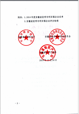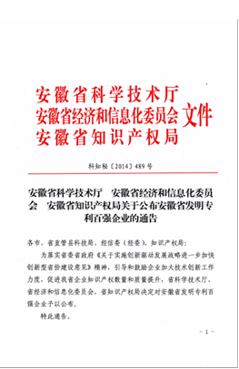 2014年12月24日安徽省科学技术厅、安徽省经济和信息化委员会、安徽省知识产权局联合公布的安徽省发明专利百强企业名单,合肥星宇公司名列第68位,这是对合肥星宇公司自成立以来高度重视知识产权和技术创新工作的肯定和激励。(王兰兰)
