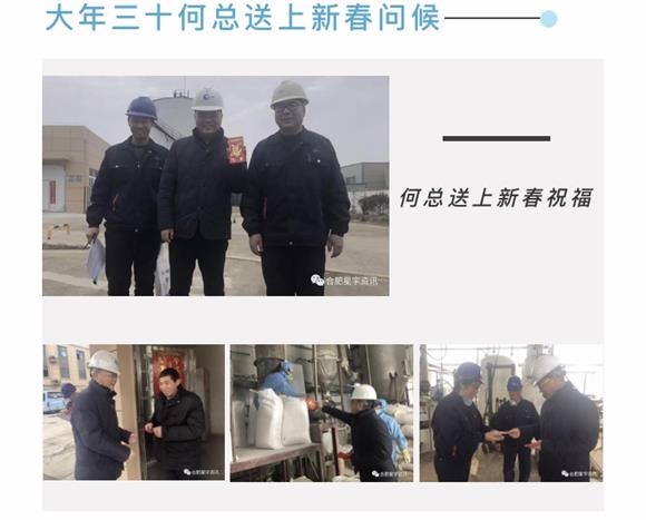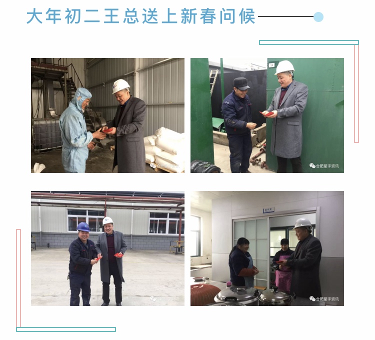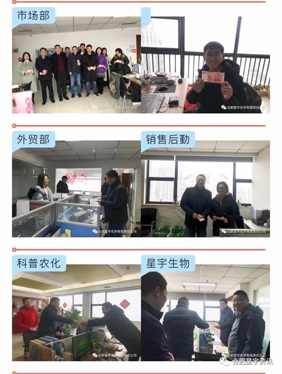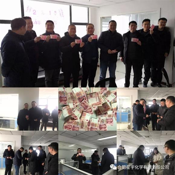 新年伊始,万象更新。合肥星宇化学在这里恭祝全国合作伙伴、企业朋友们在新的一年里身体健康、万事如意!生意兴隆、财源广进!正月初七上班第一天,公司高管们走访各个部门给员工发放红红火火的开门红包,并送上了新春祝福!