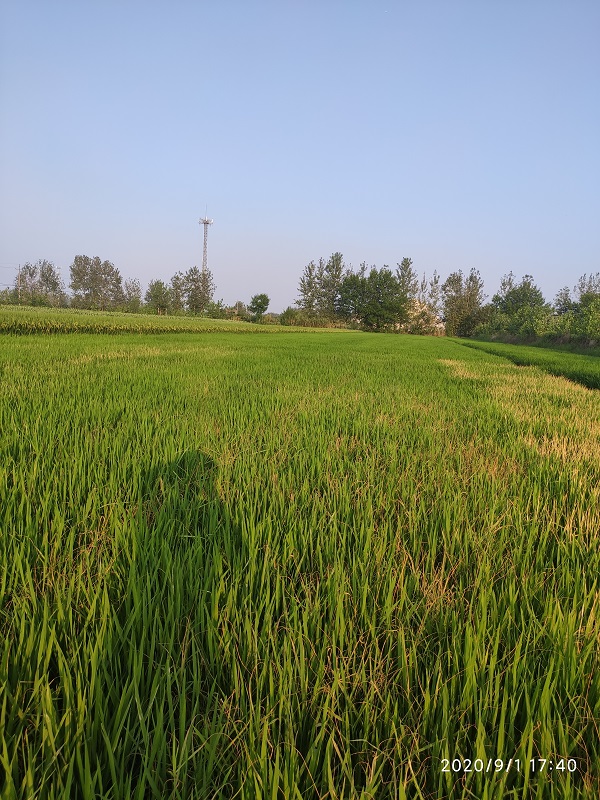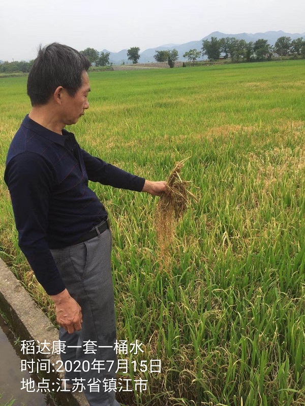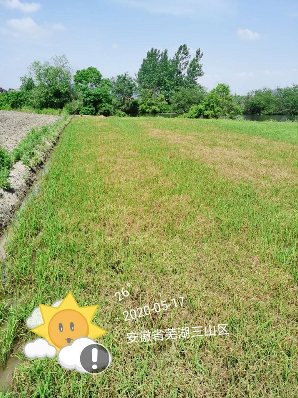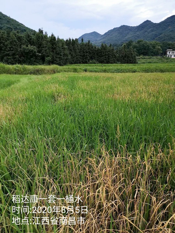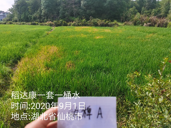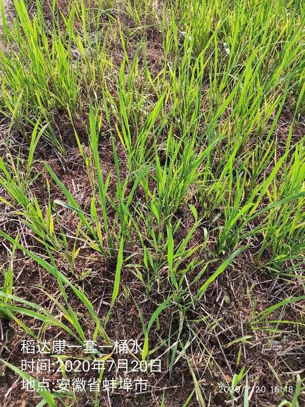 施药时间:2020年7月13日观察时间:2020年7月20日地点:安徽省蚌埠市此田块马唐、麦苗、稗草较多,马唐抗性较大;农户7月初前序药剂未防治住马唐,使用合肥稻达康®一组兑水15kg,喷匀喷透,施药面积:0.6亩;第7天效果如下:
