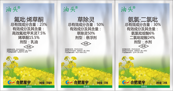 油菜是是我国最主要的油料作物,全国各地均有种植,其中在四川、安徽、湖南、湖北种植面积最大,杂草防治一直是油菜种植过程需要面对的难题。合肥星宇化学有限责任公司2020年全新上市两款针对甘蓝型油菜的全打型苗后除草剂产品:1.油头(甘蓝型油菜专用)有效成分:23%氟吡·烯草酮+10%草除灵+30%氨氯·二氯吡 规 格:30ml+10g+20g