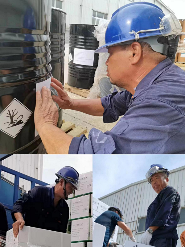 下午3点,在户外工作的装卸工王林、王圣东、袁理文正在装卸货物,货物在阳光的暴晒下变得十分烫手,但却丝毫不影响他们手上的动作,贴唛头、搬运、装卸一气呵成,干劲十足。一件件货物被装上车,一滴滴汗水随着衣角滴落。“热也没办法,不能耽误公司的出货呀。”王圣东笑着说。  (维修工:周金荣 环保车间:蒋金汛和任育玲) 为了保障工厂的正常生产和安全,维修工们逐一排查,拿着各式各样的工具,踮脚、跪着、蹲着、趴着,打开沉重的设备,“挑剔”每一个细节,对任何可能发生的潜在危险进行排查并维修。发丝间不停滴落汗水,划过额头、流入眼中,一阵不适才让他们注意到满脸的汗水。维修工说:“户外有风的情况下还能忍受(高温),大型设备的机房才是名副其实的桑拿房,进去10分钟不到衣服就要湿一遍。”