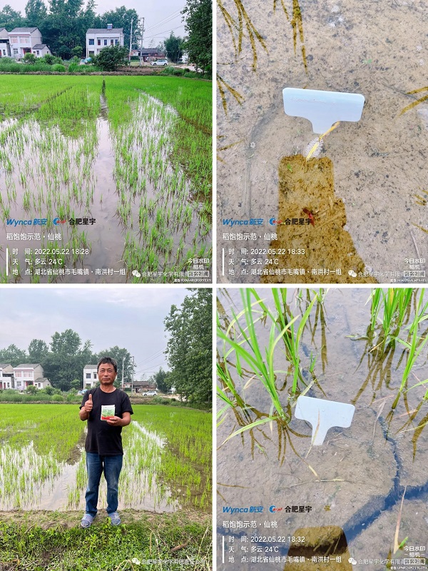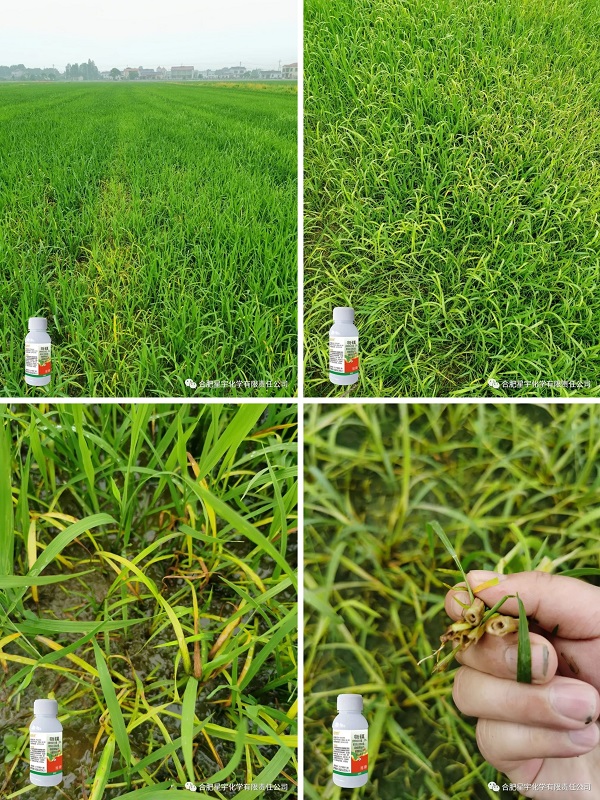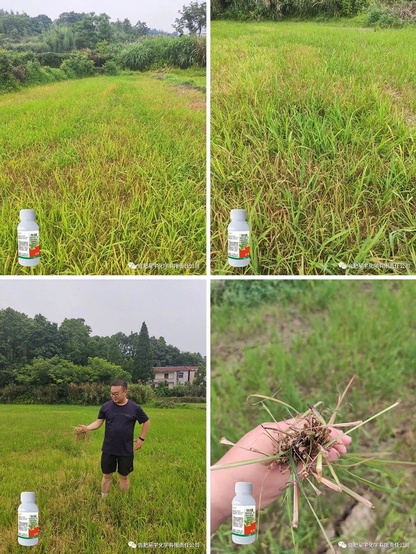 1、本品可防治水稻田马唐、稗草、千金子、双穗雀稗、狗尾草、牛筋草、碎米知风草、矶子草、野黍等禾本科杂草。 2、推荐3叶1芯后用药,正常推荐亩用量为1组,草较大较多时1组兑一桶水,喷匀喷透。 3、不建议温度低于20℃和超过35℃时候使用。 4、推荐使用手动喷雾器、电动喷雾器和无人机施药,不推荐弥雾机、拉管式喷枪施药,可能造成药害。 5、药后2-3天回水,并保水3-5天,水层不能淹没秧芯,否则会造成死苗。 湖北省仙桃市试验示范 施药时间:2022年5月15日 观察时间:2022年5月22日